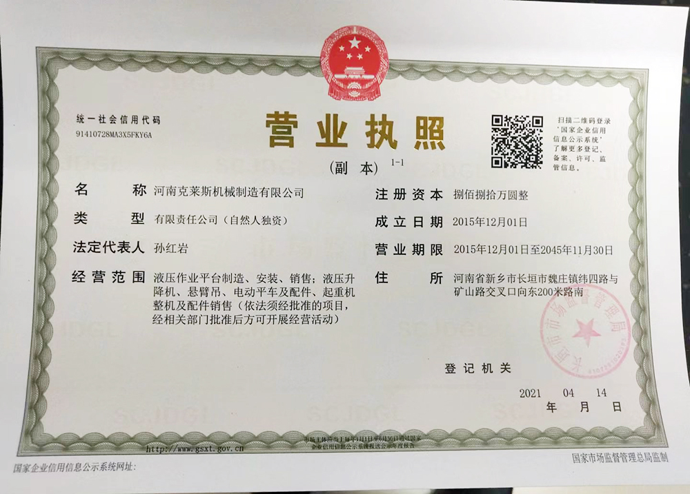 河南克萊斯機械制造有限公司位于河南省長垣市魏莊工業園區,公司注冊資金捌佰捌拾萬元整,在職員工40余名,擁有研發設計團隊,是一家生產液壓升降作業平臺及旋臂起重機生產銷售的廠家。  公司主要產品有:固定導軌式液壓升降作業平臺、移動式液壓升降平臺、車載式液壓升降平臺;定柱式懸臂吊、墻壁吊、電動平車、登車橋等。  精良的設備,嚴格的管理是公司得以不斷發展壯大、產品能夠贏得用戶依賴的根本所在。  “精確、...... <了解更多>
